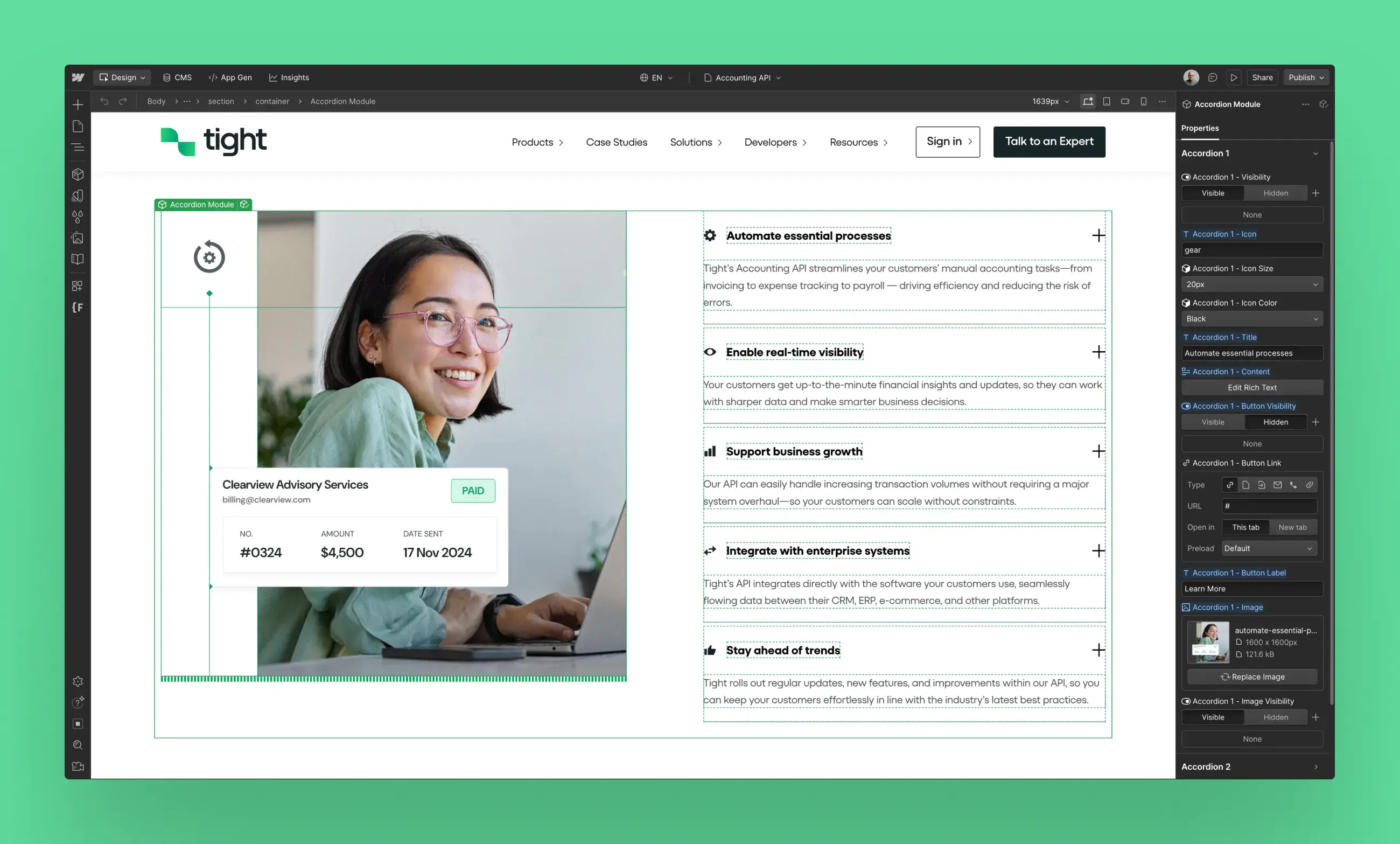 Tight’s audience isn’t made up of accountants — it’s product and engineering leads deciding whether to integrate accounting into their own platform. The site needed to move past abstract feature lists and speak directly to their priorities: adding real product value without adding technical debt. The platform includes complex functionality like double‑entry bookkeeping, invoicing, and tax reporting, which could easily overwhelm first‑time visitors without clear hierarchy or context. The challenge was to make that depth feel approachable and build trust that Tight could run reliably at scale.